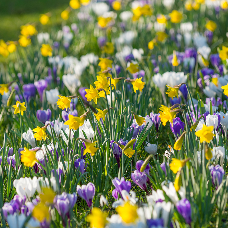 Mixed crocuses with a twist! Instead of the large-flowering yellow crocus, a beautiful yellow narcissus