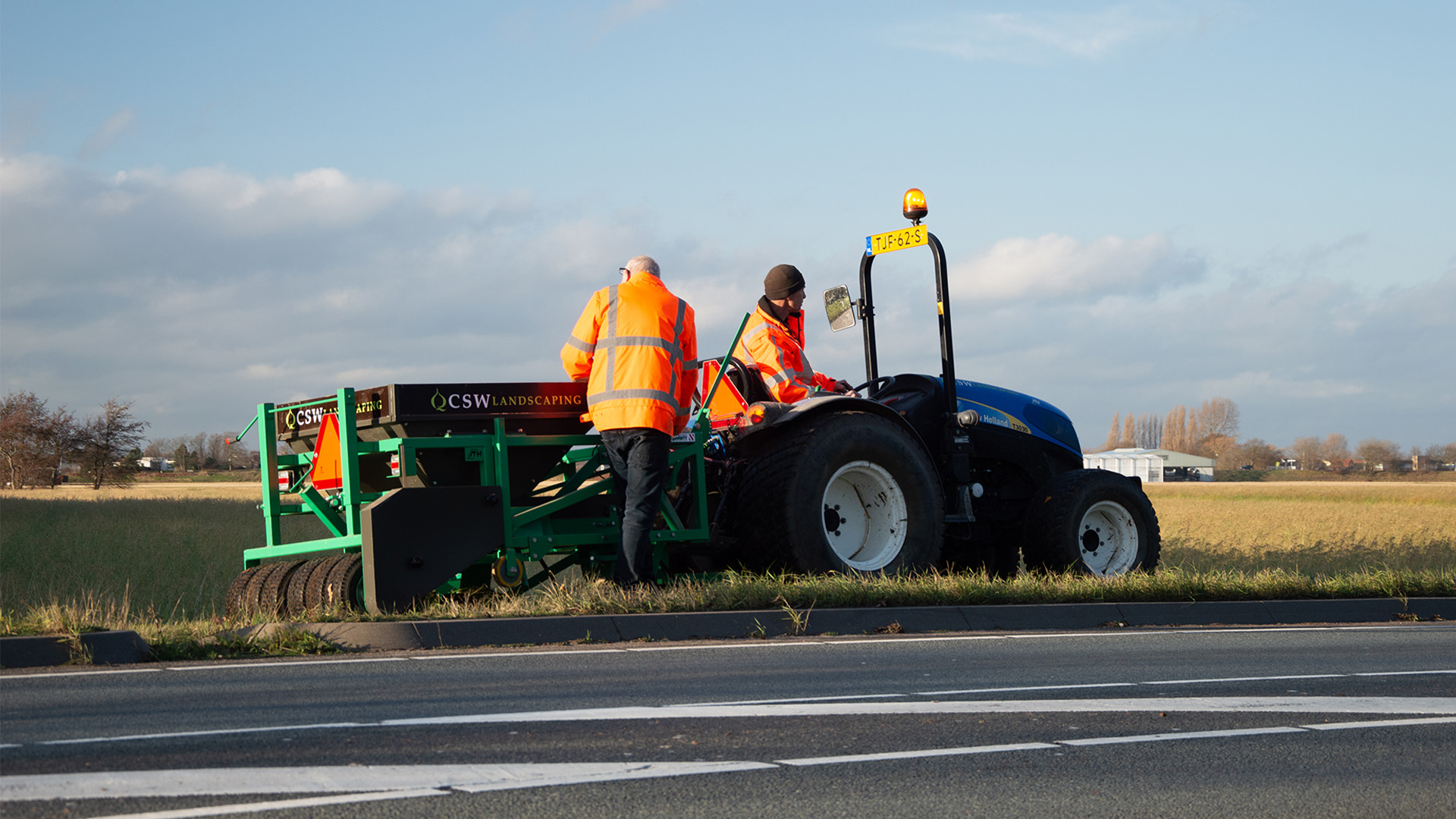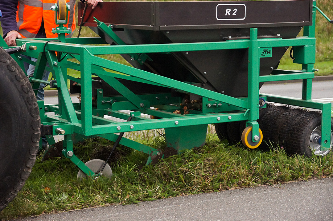 The planting machine is a combination of a small tractor with behind it the machine that carries out the process from A to Z. On top of the machine is a container in which the flower bulbs are placed. At the bottom of the machine are rotating blades, which resemble pizza cutters. When the tractor is moving, these blades will cut through the grass. After the grass has been cut open, it is folded open by the plows.